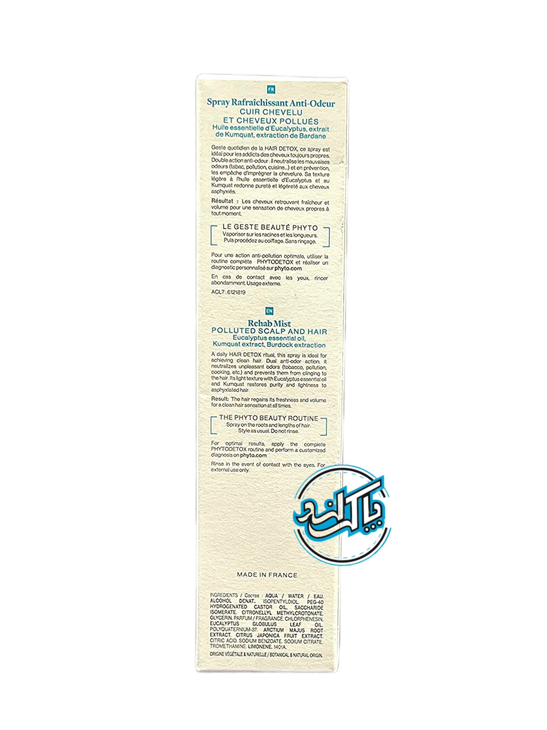 اسپری ضد آلودگی و خوشبو کننده مو فیتودتوکس Rehab Mist محصولی از برند فیتو بوده که حاوی روغن اکالیپتوس، عصاره میوه کامکوات و ریشه بابا آدم می باشد که با پاکسازی و تمیز کنندگی کف سر از هر گونه آلودگی ها و چربی باعث طراوات موها خواهد شد. اسپری فیتو مدل D-TOX Rehab Mist قادر است هر گونه بوی نامطبوع و ناخوشایند مانند دود سیگار، آلودگی و آلاینده های هوا، گرد و غبار و… را رفع نماید و به موها احساس تازگی بخشد.
