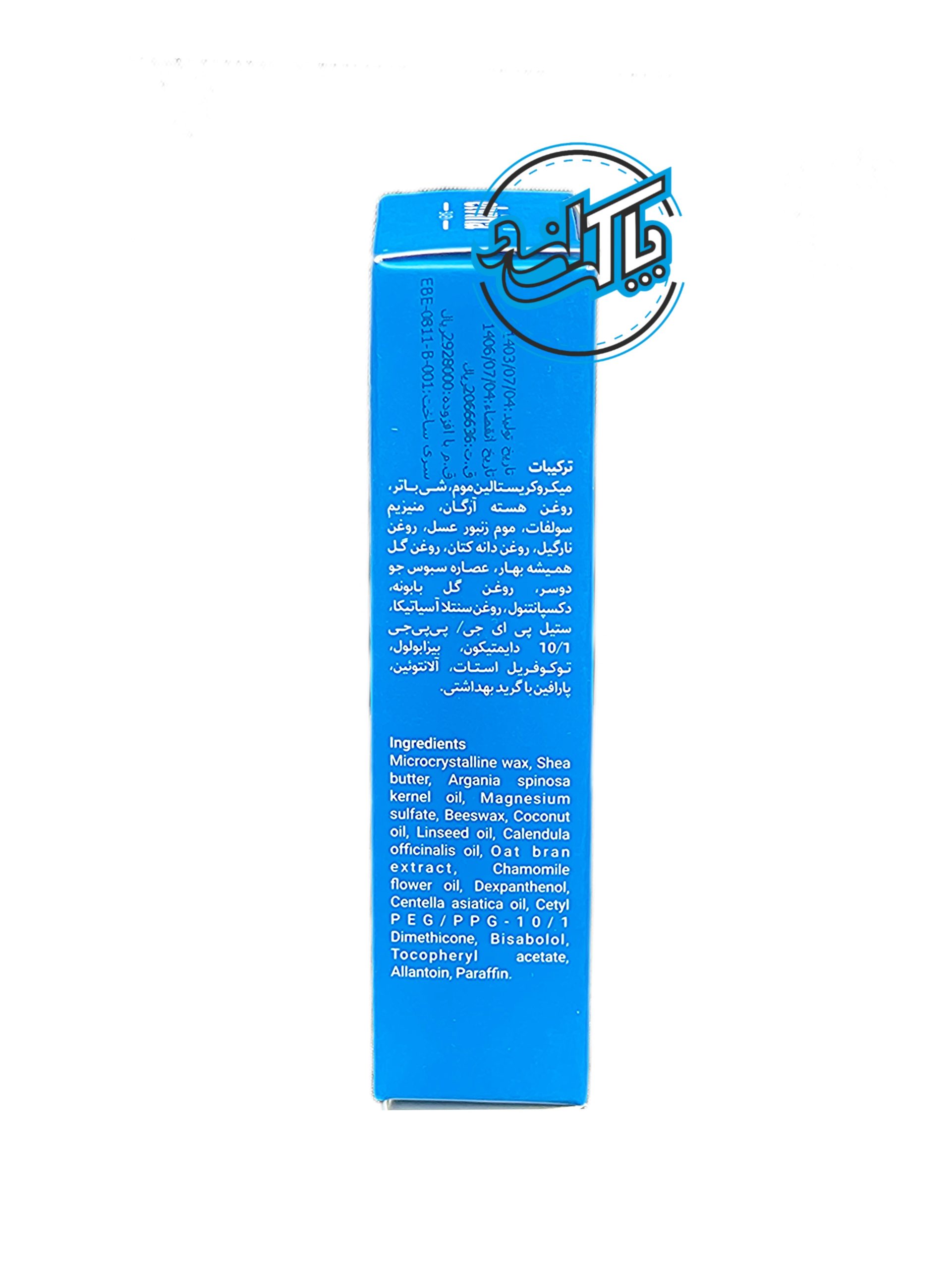 آب دیونیزه، میکروکریستالین موم، شی باتر، روغن هسته آرگان، منیزیم سولفات، موم زنبور عسل، روغن نارگیل، روغن دانه کتان، روغن گل همیشه بهار، عصاره سبوس جو دو سر، روغن گل بابونه، روغن آب بشقابی، ستیل پی ای جی، پی پی جی 10، دایمتیکون، بیزابولول، توکوفریل استات، آلانتوئین، پارافین با گرید بهداشتی.