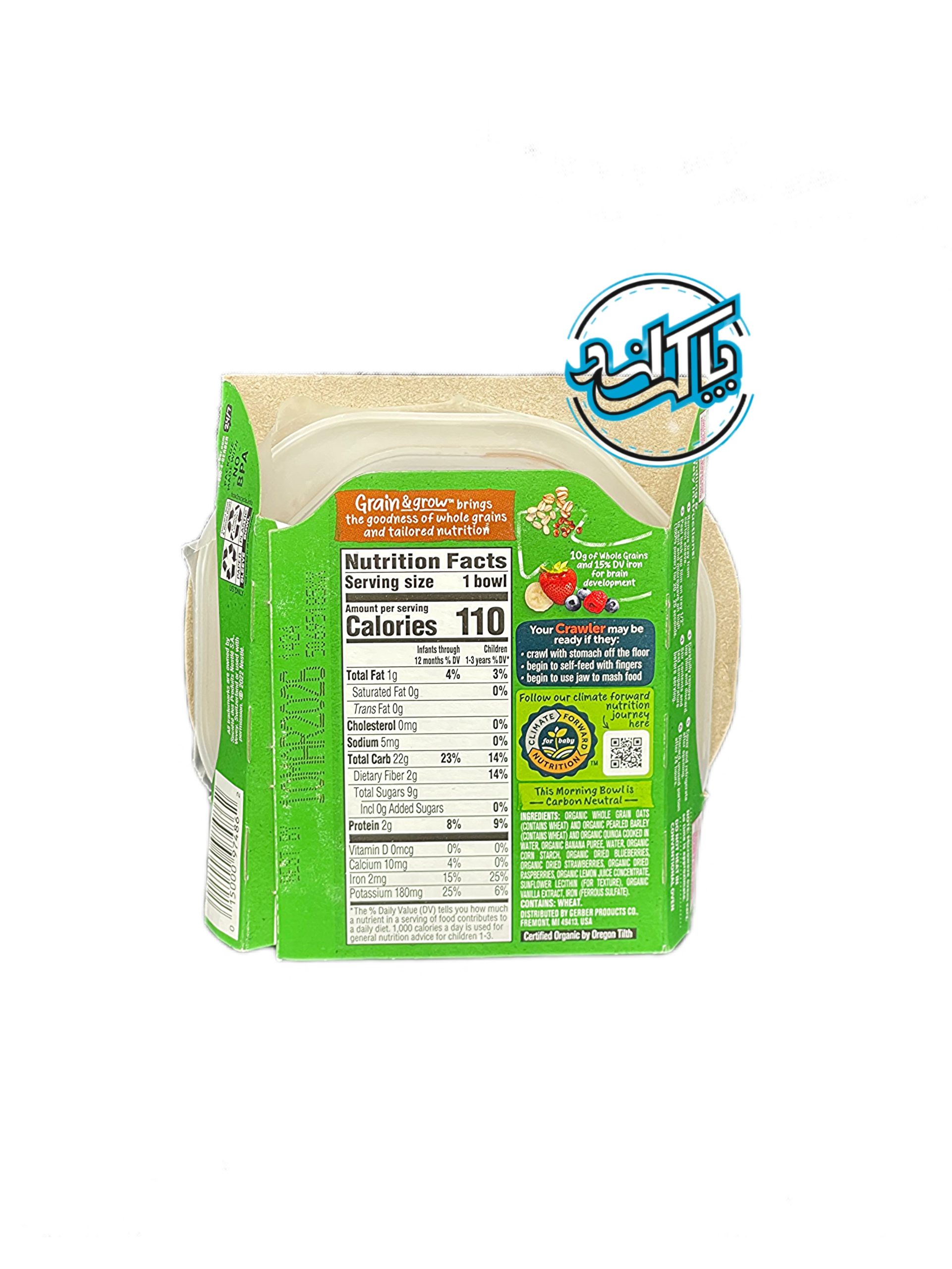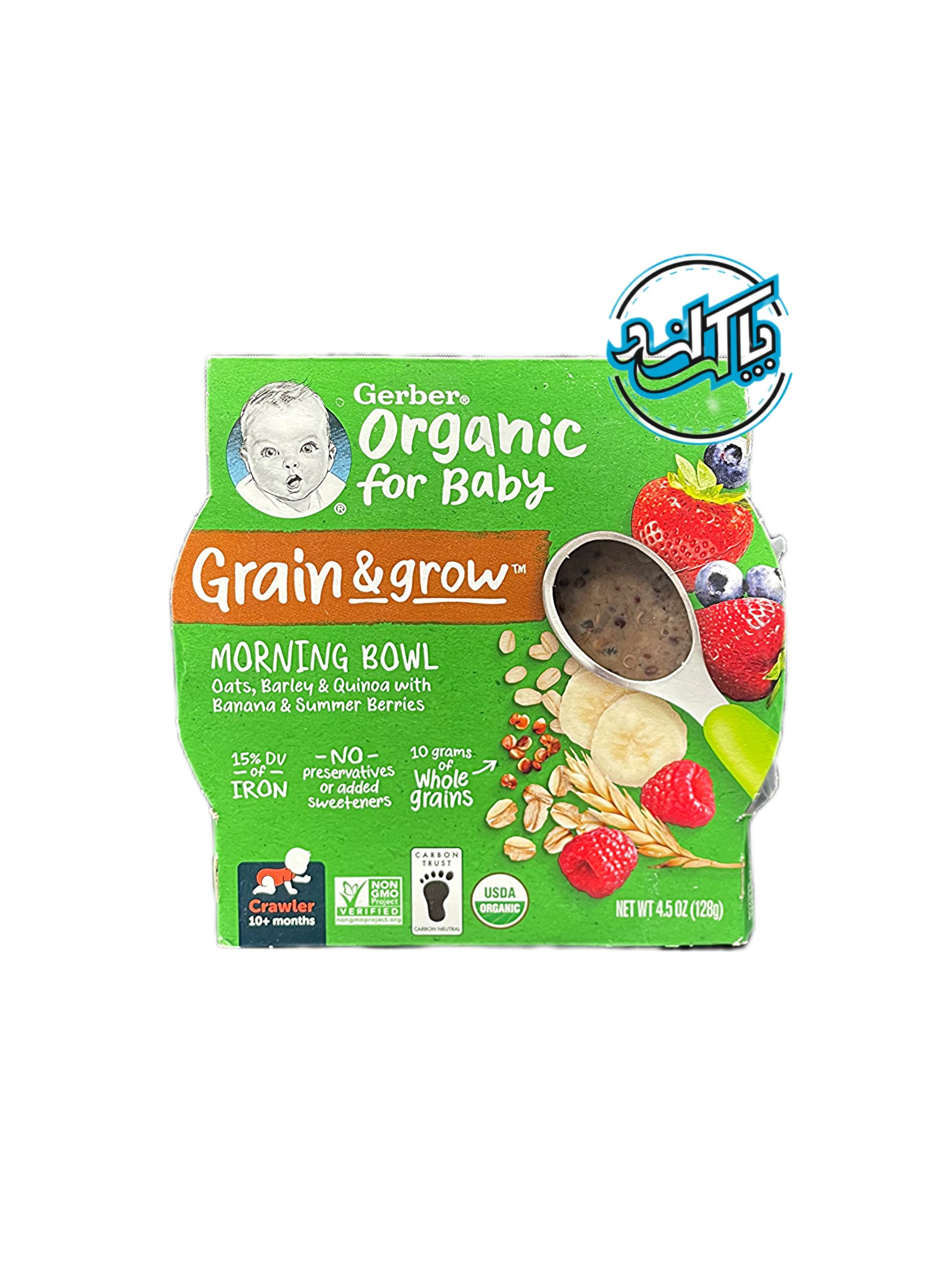 کاسه صبحانه گربر حاوی جو، جو دوسر، کینوا، موز و توت های تابستانی با تأمین 15% از نیاز روزانه آهن یک انتخاب خوب برای وعده صبحانه کودکان نوپا 10 ماه به بالا میباشد و تمام ترکیبات آن کاملا ارگانیک است.